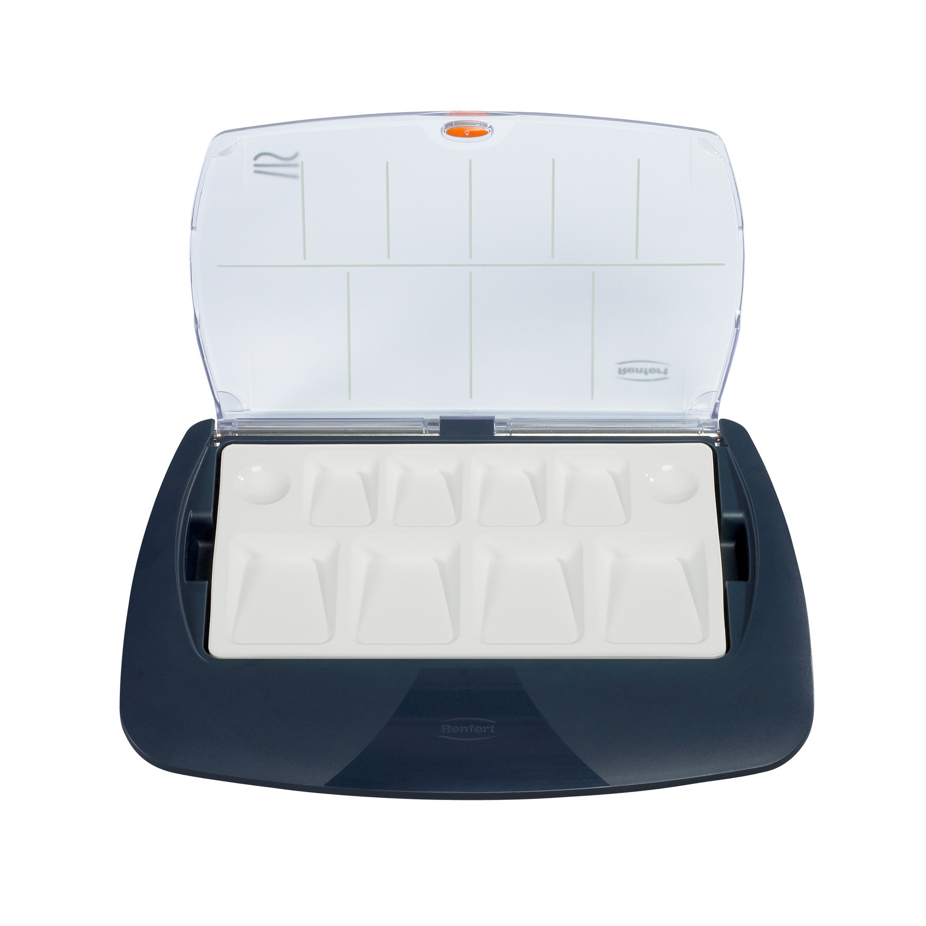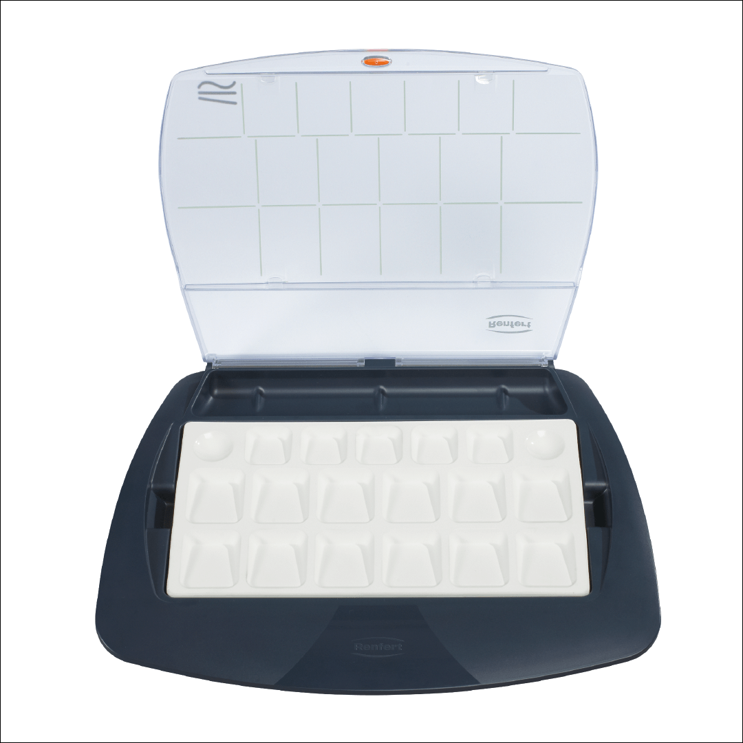 Paleta mixare ceramica Lay:art tropic pro S Renfert cu capac protector impotriva uscarii si contaminarii – usor de indepartat si distributie echilibrata a compartimentelor.