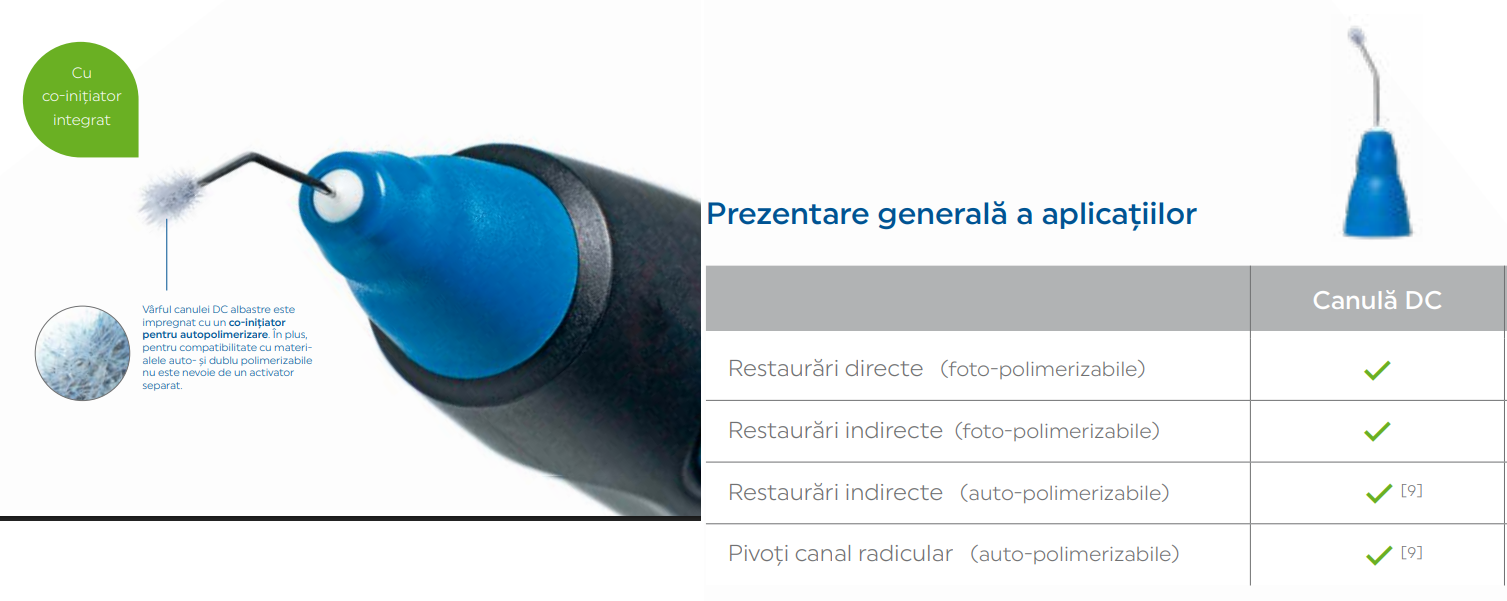 - Canula DC albastră inovatoare extinde gama de aplicații clinice pentru Adhese 2 în VivaPen, în special pentru cimentarea adezivă a restaurărilor indirecte, atunci când autopolimerizarea este necesară sau preferată.