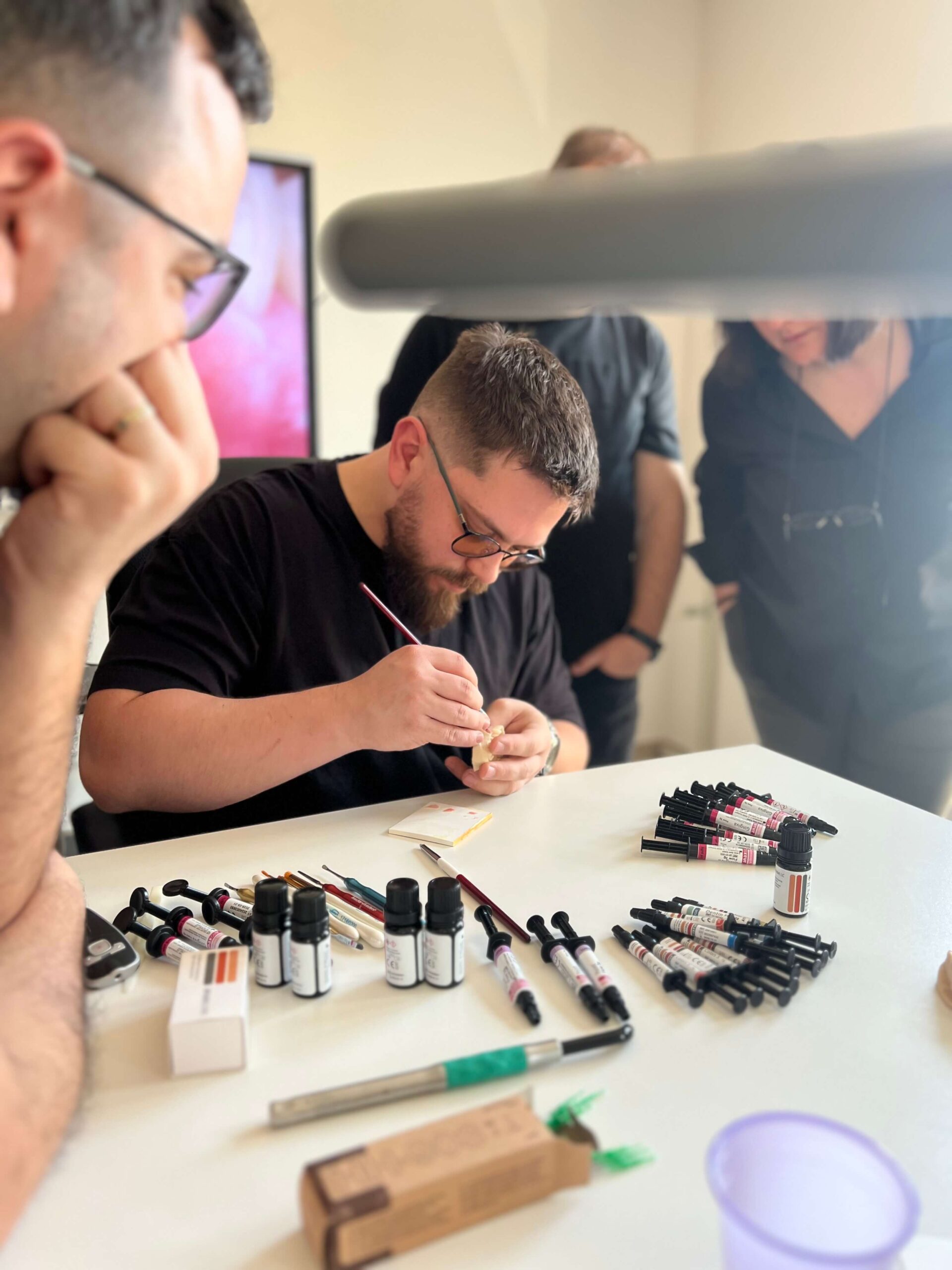 - Se extrage compozitul direct din seringă și se aplică pe zona dorită cu o pensulă sau o spatulă.