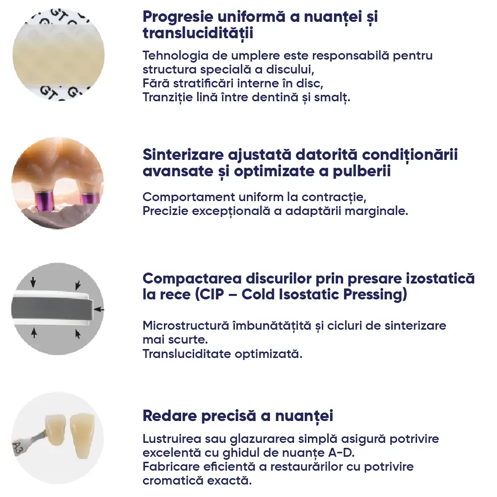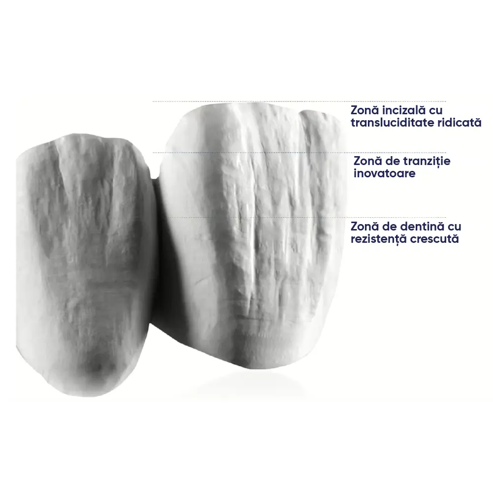 - Contine un amestec de doua materii prime de oxid de zirconiu: 4Y-TZP si 5Y-TZP.