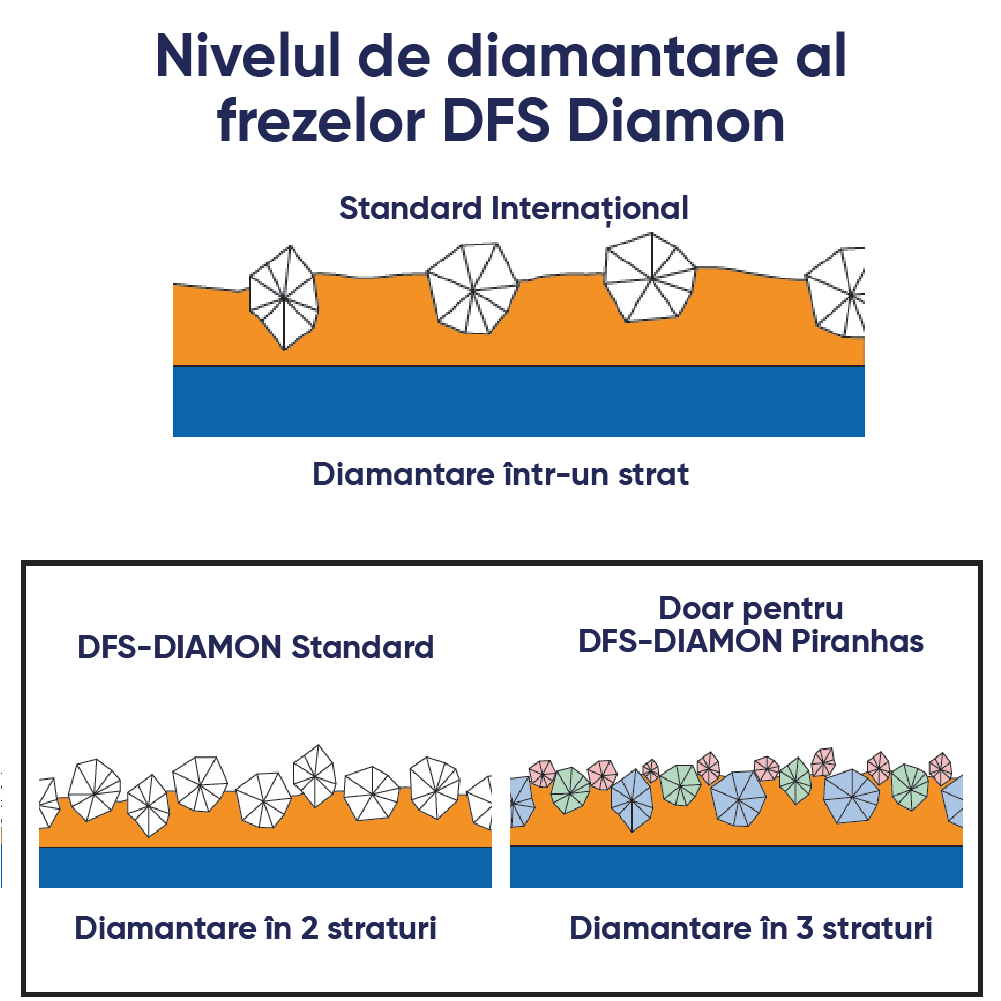 Freze diamantate FG – fabricate printr-o tehnologie avansată ce implică utilizarea diamantelor de diferite granulații în etapele succesive ale producției.
