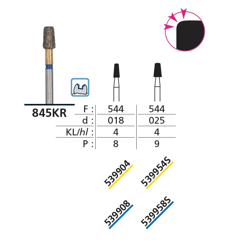 - F: 544 → formă freză (geometrie tip con invers / preparare cavități)