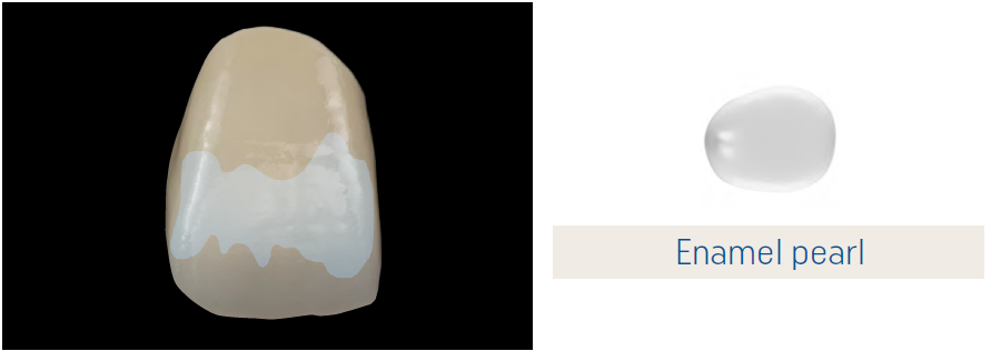 Pasta de e.max Ceram Art Illusion Enamel pearl se aplică pentru a crește valoarea (luminozitatea) în treimea incizală și de-a lungul crestelor marginale pentru a crea un efect de “fluture”.