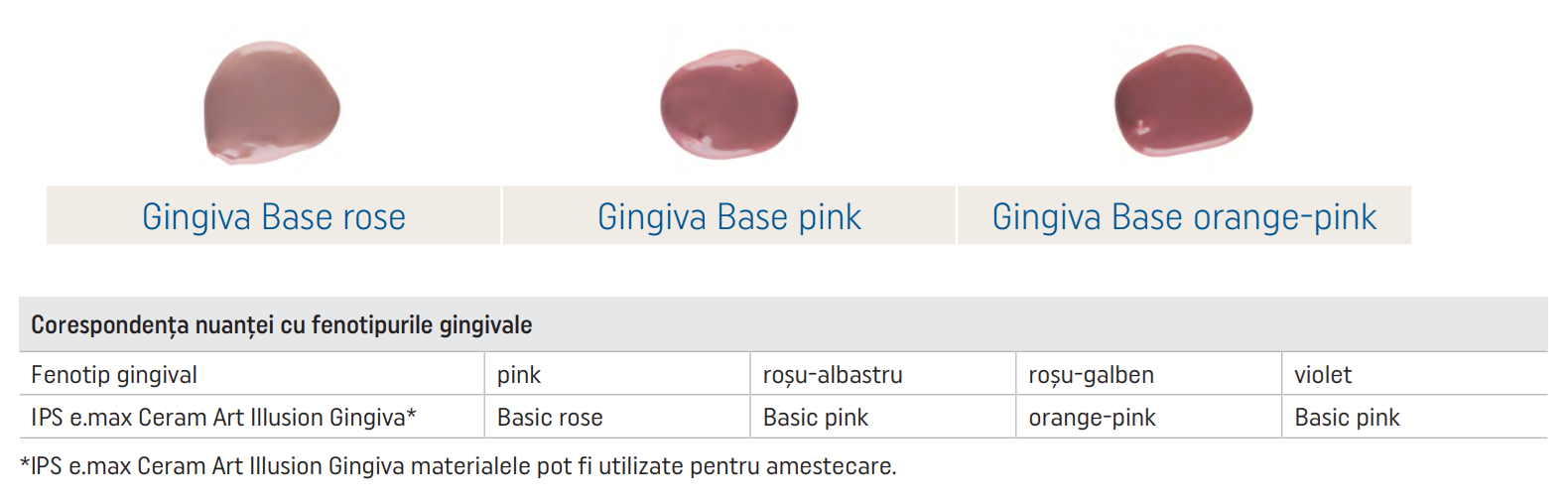 - Pastele IPS e.max Ceram Art Illusion Gingiva Base sunt utilizate pentru a reconstrui cea mai mare parte a țesutului gingival, nuanța fiind selectată pentru a se potrivi fenotipului gingival specific.