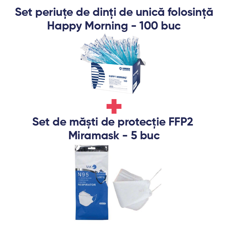 Pachetul conține un set de periuțe de unică folosință Happy Morning și un set de măști de protecție FFP2